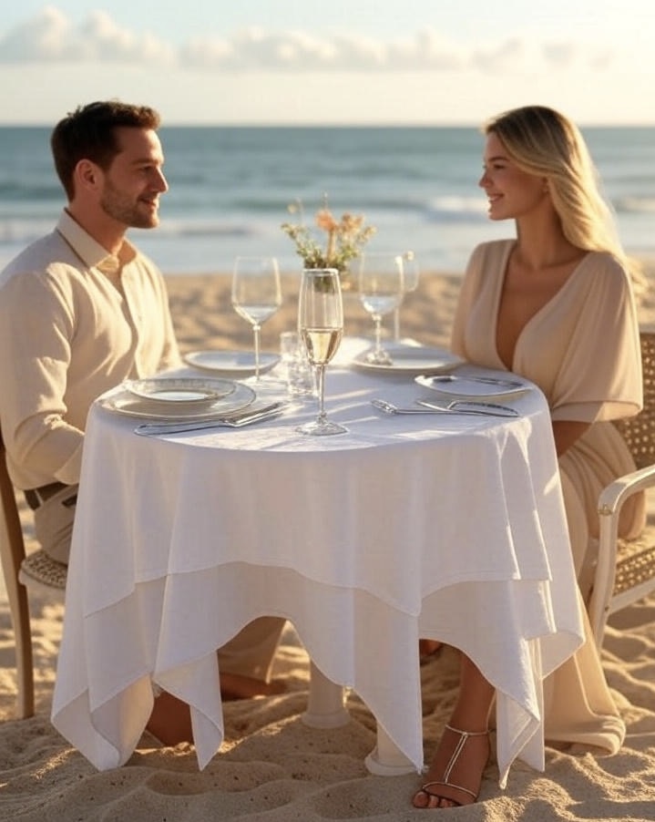 Beach picnic at low tide with linen tablecloths, chilled Vinho Verde, and handmade pastries